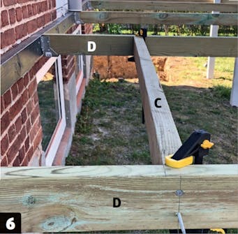 Ved ikke at føre murremmen (C) helt ud til hjørnet bliver der plads til at fastgøre sideremmene, så de flugter med husmuren. Tvingen sikrer, at højden bliver ens. Fastgør med 5 x 100-mm galvaniserede skruer.