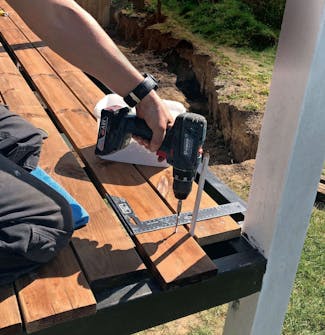 Og så er det bare om at montere resten af brædderne med 5 x 60-mm rustfri terrasseskruer. Vi monterer skruerne i en vinkel på 90 grader og husker at bruge blyanten som afstandsklods hver gang.