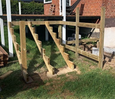Ved at klodse trappevangerne op på tre fliser undgår vi, at der trænger fugt op i dem nedefra. Herefter fastgøres den øverste del af vangerne, hvorefter vi bygger skelettet, som vildmarksbadet skal stå i. Vi kan dog ikke montere trappetrin og sidebeklædning på skelettet, før badet er tilsluttet og klar til brug.