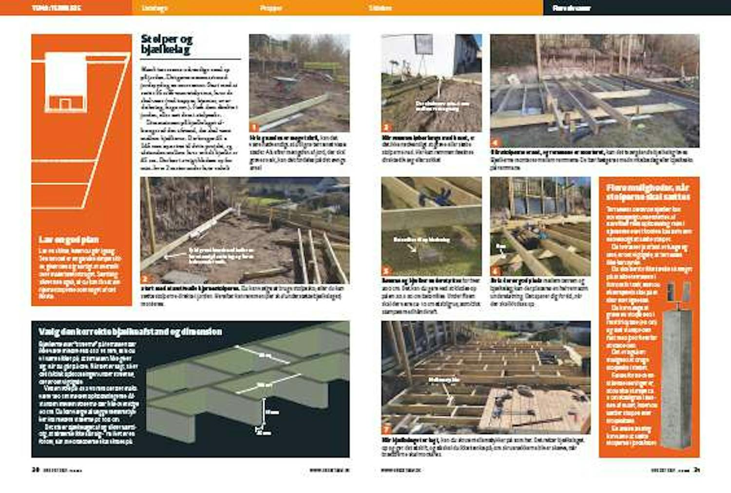 Remme og bjælker understøttes for hver 200 cm. Det kan du gøre ved at klodse op på en 30 x 30 cm betonflise. Under flisen skal der være ca. 10 cm stabilgrus, som blot stampes med håndkraft.