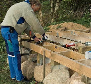 TIPS: Som du kan se, fikserede vi terrassens kant på lægter, da vi klodsede andre dele af den op på fliserne. Den skal være i vater og balance, når den samles med stolpeskoene.