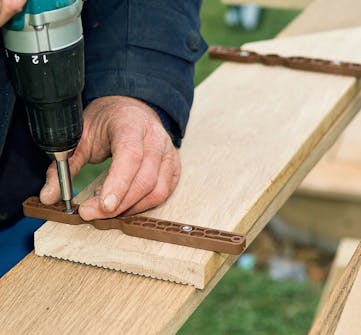 Soklens hjørner skal samles med vinkelbeslag (J). Husk, at du ikke skal fylde skruer i alle huller - de anbringes, så de ikke flækker træet. Brug altid beslagskruer i beslagene, her i rustfrit stål, der holder længst i det trykimprægnerede træ.