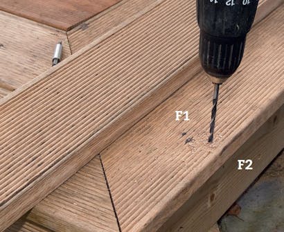 De lodrette sider (F2) sættes op til sidst. I første omgang fæstner vi dem med 60 mm skruer ovenfra gennem det yderste bræt (F1). Her accepterer vi altså en skrue fra oversiden, ideelt bør du forsænke den og lukke hullet med en træprop.