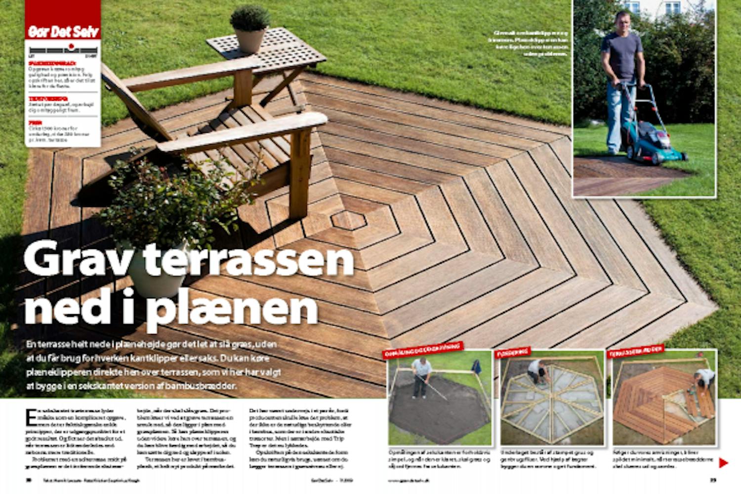 Vi har valgt bambusbrædder til terrassen. De har, i lighed med mange andre terrassebrædder, en glat og en rillet side. Du kan selv vælge, hvilken side du vil have opad. Den rillede side gør brædderne mere skridsikre. Til gengæld samler rillerne lettere snavs og alger.