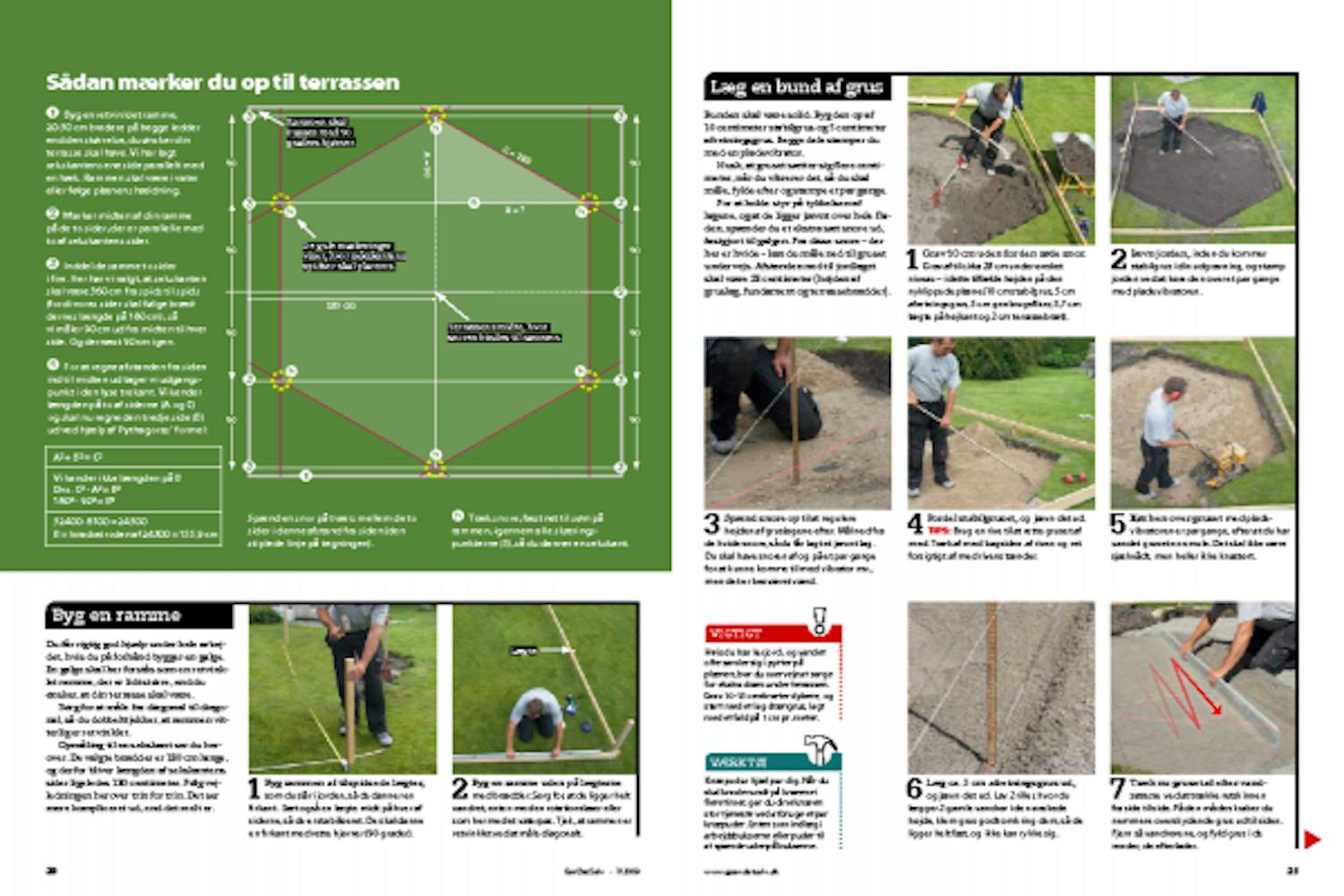 Næste skridt er en ramme, der er lidt mindre end den endelige terrasse. Rammen danner udgangspunkt for fundamentet af lægter og skal blot sidde skjult under terrassen. Rammen forsynes med et kantbræt, der rager helt ned til gruset, så der ikke kan løbe jord ind under rammen og dermed terrassen.