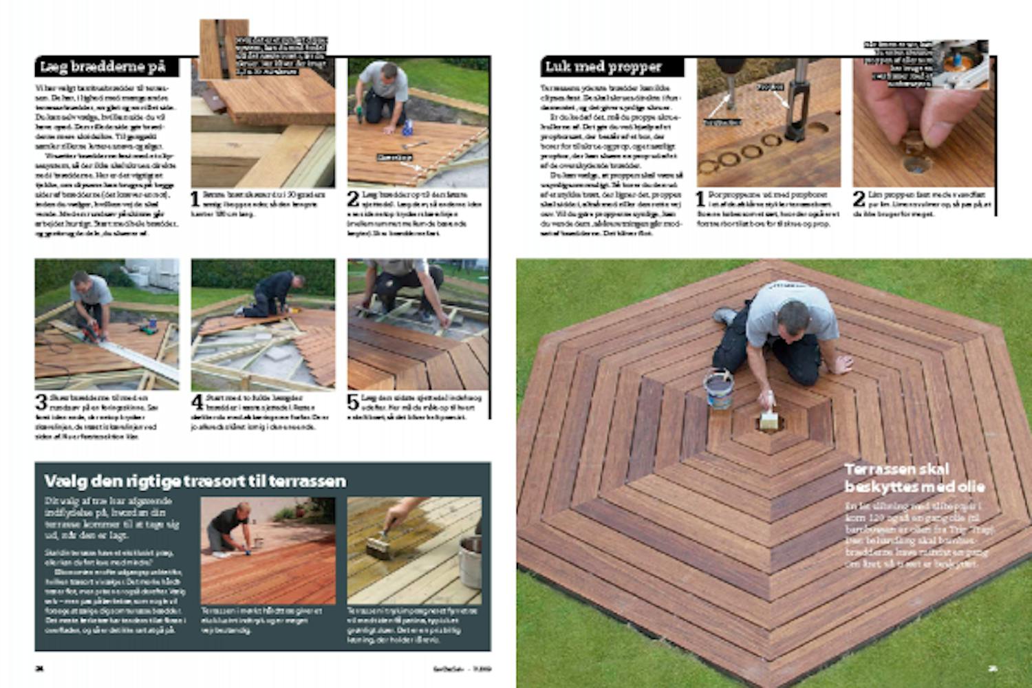 Bor propperne ud med propboret i et af de afskårne stykker terrassebræt. Borene købes som et sæt, hvor der også er et forstnerbor til at bore for til skrue og prop.