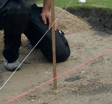 For at holde styr på tykkelsen af lagene, og at de ligger jævnt over hele fladen, spænder du et ekstra sæt snore ud, fastgjort til galgen. Fra disse snore - der her er hvide - kan du måle ned til gruset undervejs. Afstanden ned til jordlaget skal være 28 centimeter (højden af gruslag, fundament og terrassebrædder).