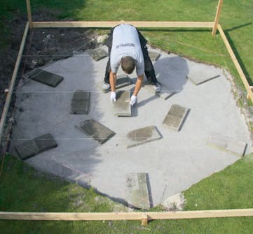 Bunden skal være solid. Byg den op af 10 centimeter stabilgrus og 5 centimeter afretningsgrus. Begge dele stamper du med en pladevibrator.