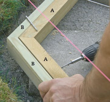 Sæt et kantbræt (B) uden på lægten. Det skal stoppe jorden fra at falde ind under terrassen. Vi har brugt et tryk imprægneret terrassebræt, der er højere end rammelægterne. Bliver brættet synligt, skal du bruge samme træ som til terrassen.