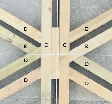 Brug en stump kantbræt til at holde afstanden imellem lægterne (C). Sæt lægterne (D) og (E) fast. Skru det hele sammen med 5 x 80 mm A4skruer (rust og syrefaste).