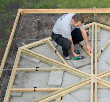 Læg brædder op til den første sjettedel. Læg dem, så enderne i den ene side netop krydser skærelinjen (mellemrummet mellem de bærende lægter). Skru brædderne fast.
