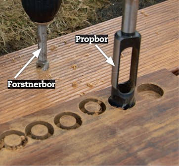 Er du ked af det, må du proppe skruehullerne af. Det gør du ved hjælp af et propborsæt, der består af et bor, der borer for til skrue og prop, og et særligt propbor, der kan skære en prop ud af et af de overskydende brædder.