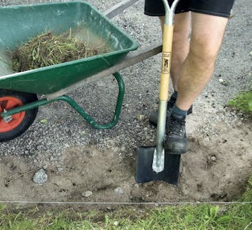 Vi fjerner græstørv og muld i hele området, hvor terrassen skal ligge. Det giver os en stabil bund at lægge terrassen på, og det gør det ret enkelt at jævne området ud. Her er jorden tæt og sandet 10-15 cm nede, så vi slipper ret nemt.