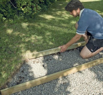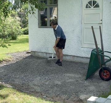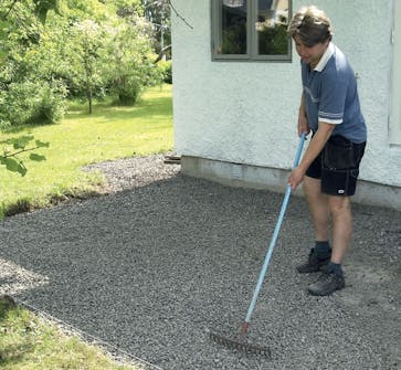 Vi fylder op med skærver i området. De kantede granitskærver i størrelse 8-16 mm pakker godt og stabilt. Hvis du bruger grus, hvor stenene er rundere, vælger du stabilgrus, hvor det er de forskellige kornstørrelser, der gør blandingen stabil.