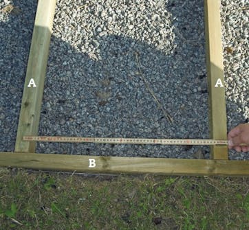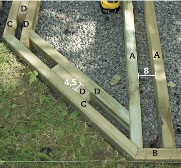 Vi placerer de parallelle lægter (A), der skal ligge under den store flade med brædder i fuld længde, så de ligger for hver 60 cm, sådan cirka. Det er den såkaldte cc-afstand, målt fra center til center, så der er altså godt 55 cm luft imellem dem.