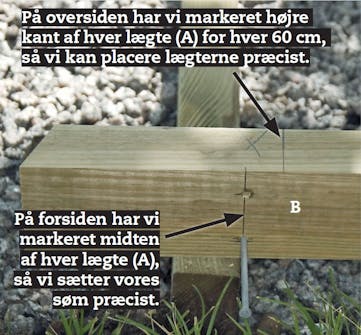 De parallelle lægter (A) gør vi fast på forkant og bagkant (B) med 130 mm søm. Du kan også skrue, i begge tilfælde er det bedst at forbore, så træet ikke flækker. Placeringen af lægternes ene kant og af sømmene streges op på kantlægterne.