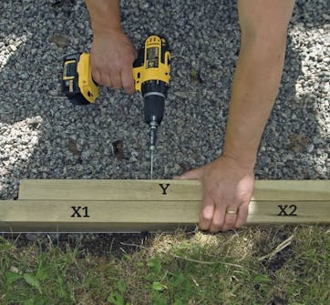 Du kan hurtigt lægge to lægter i forlængelse af hinanden med en såkaldt laske. Her er det de to stykker X1 og X2, som samles med lasken Y - et stykke lægte på en god meters penge, som skrues på indersiden af de to andre.