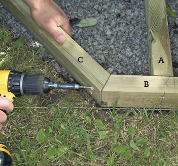 Her samler vi rammen i det første bløde hjørne. Det er svært at samle med søm, uden at stykkerne glider, så vi bruger 5 x 80 mm skruer, to fra den ene side og en enkelt fra den anden. De to lægter er her skåret med kapsaven sat på 22,5 grader.