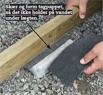 Derefter er underlaget så stabilt, at terrassen blot lægges på et passende antal betonsten oven på skærverne.