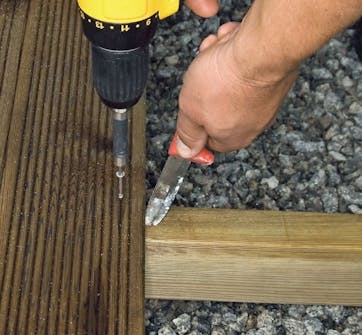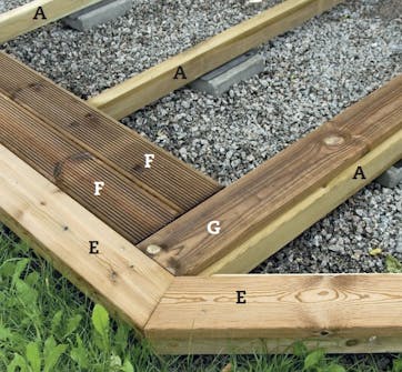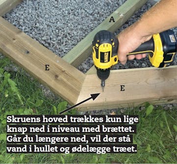 Kantbrædderne (E) sætter vi på først. I de “bløde” hjørner på 135 grader skæres de til med kapsaven på 67,5 eller 22,5 grader. Vi skruer dem fast med rustfri terrasseskruer på 4,2 x 55 mm, der har skærespids og forsænkerribber.