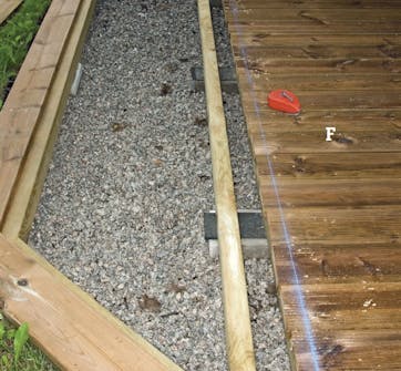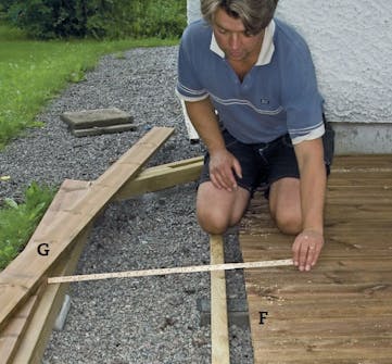 Dæksbrædderne (F) rettes til i den anden ende på én gang, så de kommer til at flugte helt præcist. Vi måler op, så de vil række 2 cm ind på den 45 mm brede lægte, så er der nemlig plads til 5 mm luft, når skillebrættet (G) også får 2 cm.