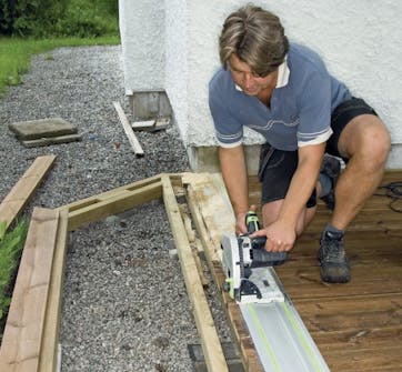 I stedet for på forhånd at skære vores træ i skelettet til lægger vi det ud på vores skærver og skærer og samler så hen ad vejen. I første runde koncentrerer vi os om den store regulære flade, som tilpasses længden på terrassebrædderne. Når den er på plads, føjer vi de to fløje med afkortede terrassebrædder og skæve vinkler til, skåret til undervejs.