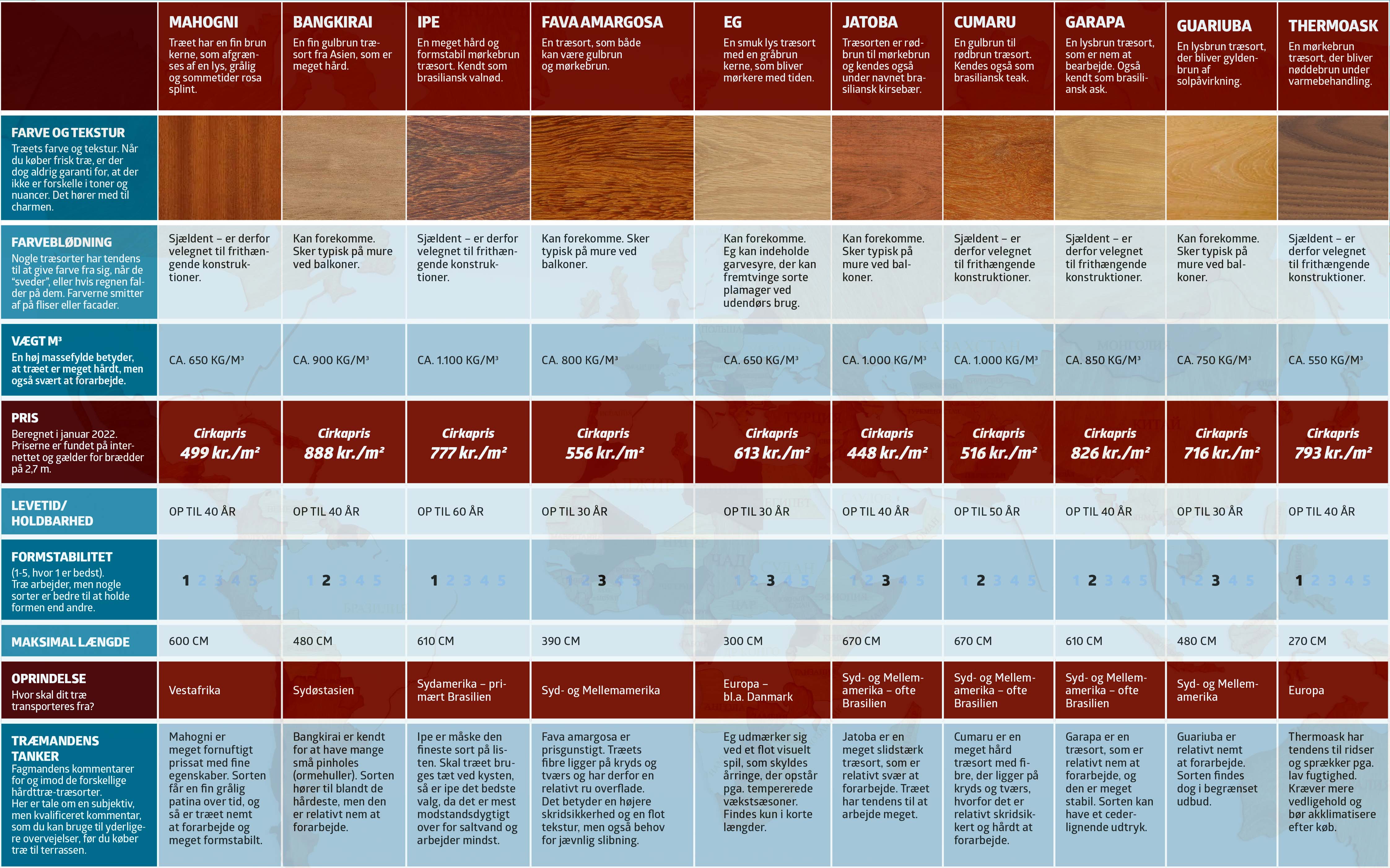 I skemaet her får du et overblik over de mest almindelige hårdttræ sorters farve, tekstur, pris og levetid mm.