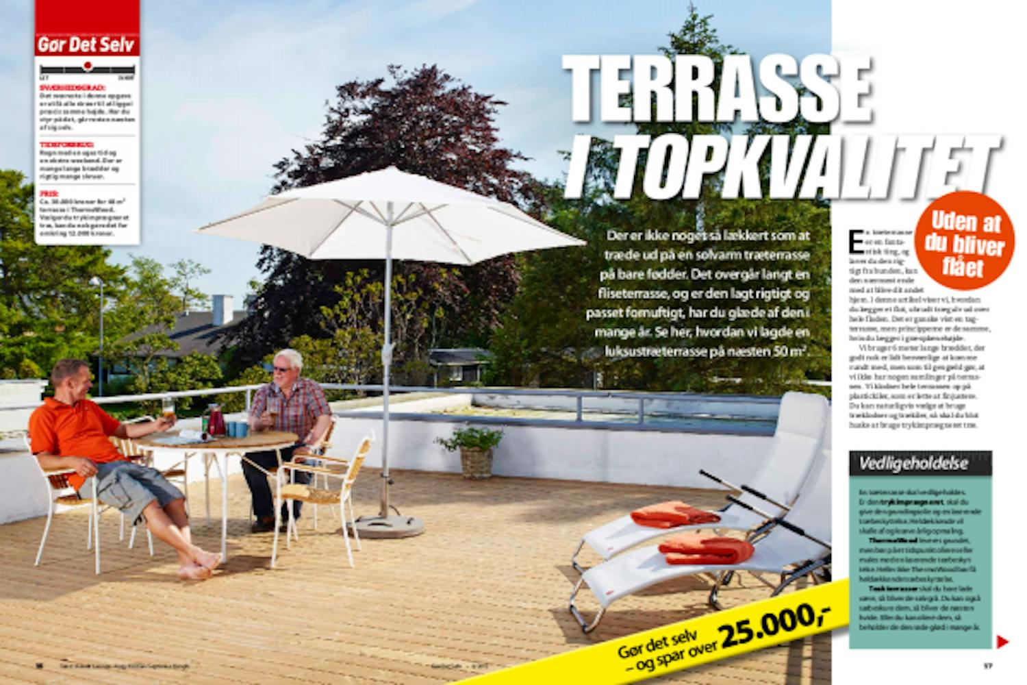 Ca. 30.000 kroner for 48 m² terrasse i ThermoWood. Vælger du trykimprægneret træ, kan du nok gøre det for omkring 12.000 kroner.