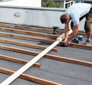 Vi bygger denne terrasse oven på et fladt tagpaptag med en anelse fald hen imod et tagnedløb på midten. Det kræver ikke de store forberedelser, bortset fra at taget skal være renset for småsten og grene, så intet kan blive trykket ned i pappet og skabe utætheder.