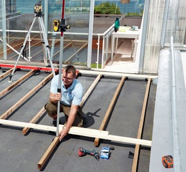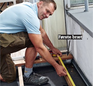 Læg brædder på strøerne, og skru dem fast til de yderste strøer efter opstregningen. Først senere skruer du brædderne fast til alle de andre strøer.