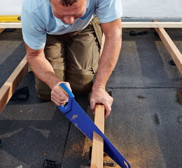 Spring først fem brædder over ved afløbet, og når alle andre brædder er lagt, kan du save brædder til, så de ligger halvt inde på strøerne på hver side af afløbet i taget.