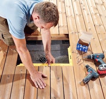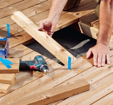 Læg terrassebrædder rundt om afløbet. Fem brædder saves til og lægges, så de rager halvt ind på strøen. Ret til efter en vinkel, og skru dem fast. Gentag i modsatte side, så der bliver et hul over afløbet.