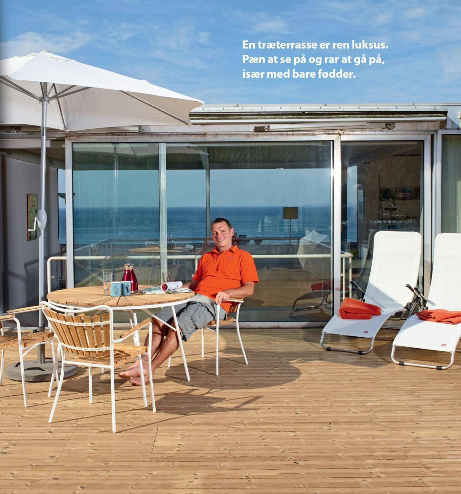 Når terrassen er så stor som denne, er det intet problem, den er 820 cm bred, og derfor kan du sagtens fordele afstanden, så den går op. Er terrassen mindre, kan du komme i den situation, at du ikke kan få det til at gå op. Så må du starte med et ¾ bræt inde ved væggen og så fordele resten.