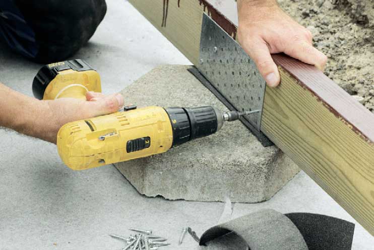 Skub minimum et lag tjærepap ind mellem bjælker og fliser. Små højdeforskelle udlignes med flere lag pap. Alle bjælkerne skrues fast til tværbjælken med 2 x 100 mm lange skruer.