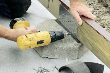 Når brædderne er på plads, skrues de med to skruer i hver bjælke. Over de bjælker, hvor brædderne er samlet, trækkes to snore, og der sættes to skruer på hver side af samlingen.