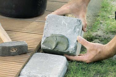 Stenene lægges på plads en ad gangen. Med en stor hammer - eller mukkert - bankes de ned i niveau. Sørg også for at banke dem helt sammen, så betonklæberen får god kontakt.