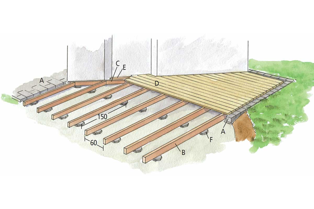 Terrassen hviler på 50 x 150 mm trykimprægnerede bjælker (B). Der skal være 40-70 cm mellem bjælkerne - afstanden afhænger af, hvor kraftige terrassebrædder (D) du vælger. Jo kraftigere brædder, jo større spænd kan du lave. Vælg også bjælker, som ikke krummer.