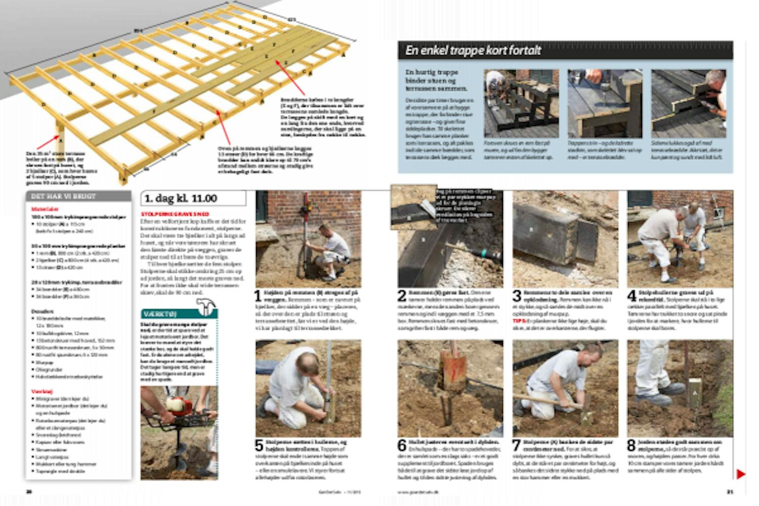 Til hver bjælke sætter de fem stolper. Stolperne skal stikke omkring 25 cm op ad jorden, så langt det meste graves ned. For at frosten ikke skal vride terrassen skæv, skal de 90 cm ned.