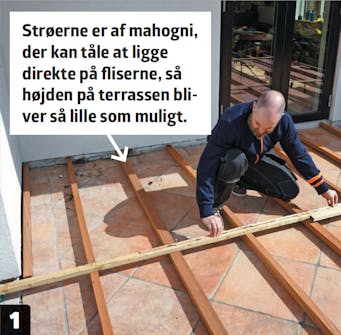 Trappen skal her føre op til en hævet fliseterrasse, hvor der skal laves en træterrasse. Det er vigtigt at kende højden på den. Lav derfor en prøveopstilling med strøer, så du kan måle op, hvor høj trappen skal være.