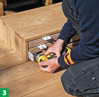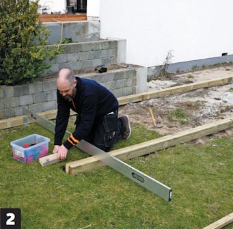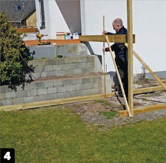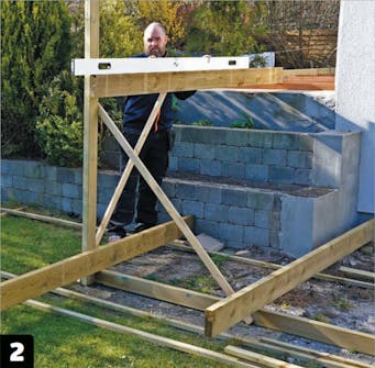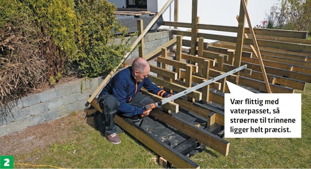 Lav en prøveopstilling fra overkanten af strøerne på den hævede terrasse til overkanten på den bærende konstruktion, hvor det nederste trin skal være. Sørg for, at delene placeres præcist, og fiksér dem.