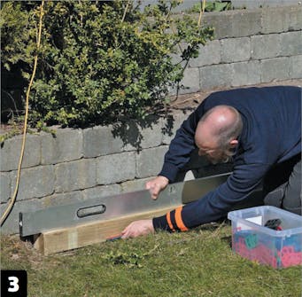 Remmen klodses op, så den har samme niveau som den inderste rem. Tjek med vaterpasset, at underlaget er helt lige. Remmen består af to reglar, der er samlet til ét stykke for at give ekstra styrke.