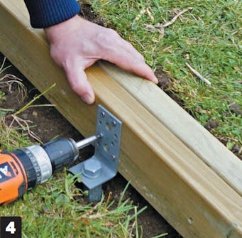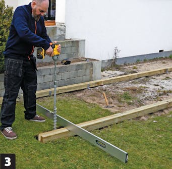 Der skal graves ud til remmen forneden, så den bærende konstruktion får den rigtige sluthøjde. Sørg for, at træet ikke er i kontakt med jord, da det nedsætter træets levetid.