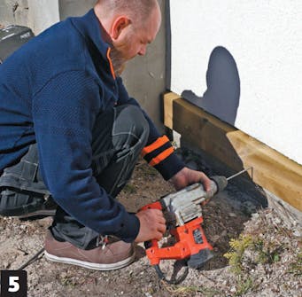 Der fastgøres også en rem på huset til terrassen, der skal bygges ud til den ene side for enden af trappen. Remmen på huset har en kraftigere dimension og fastgøres med lange skruer, som der først bores for til.