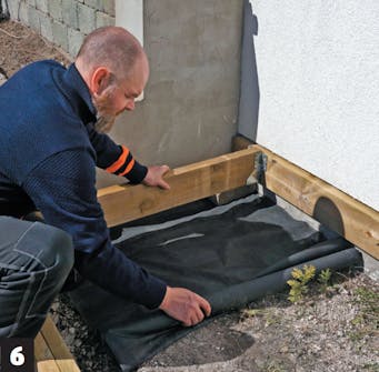 Der lægges fiberdug ud under konstruktionen, så der ikke kommer lys til evt. spirende ukrudt i jorden, der kan vokse op mellem brædderne på træterrassen.