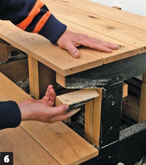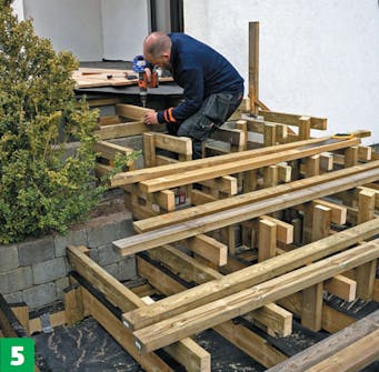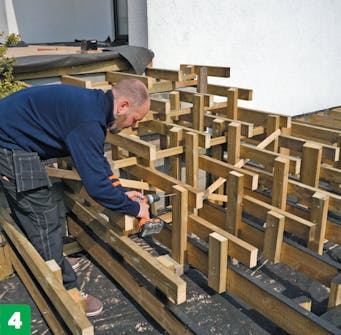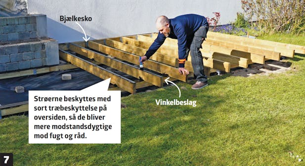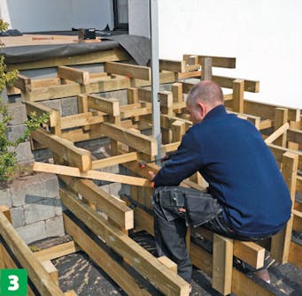 Byg den bærende konstruktion til de enkelte trin med udgangspunkt i din opstilling. Tjek højden, så strøerne til hvert trin ligger i præcis samme niveau. Trinnenes strøer fastgøres til lodrette reglarstykker, der er monteret til de kraftige strøer på bundremmene.