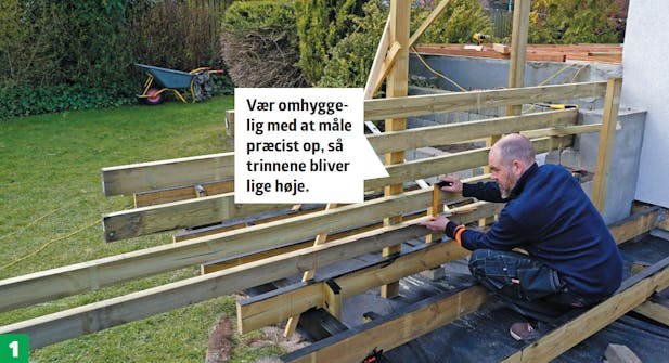 Start med det øverste trin, og tilpas dybden på trinnet, så det passer med hele brædder, her tre. Strøerne til trappetrinnet skæres til, så det passer i længden til tre terrassebrædder og et bræt på stødtrinnet.