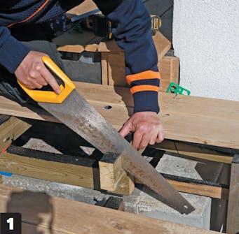 Sav brædderne til i enderne. Det er lettest og bliver pænest, hvis du gør det med en dyksav med føringsskinne. Det kan være nødvendigt, at du gør det undervejs i byggeprojektet, så du bedre kan komme til at lægge brædder på trinnene.