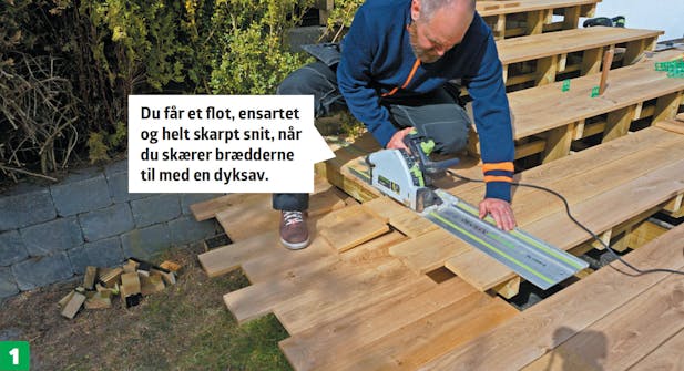 Når du har monteret alle terrassebrædderne, skærer du dem til i enderne. Det går langt hurtigere, hvis du fastgør brædderne uden først at skulle måle op til en præcis længde på hvert enkelt bræt, så de kommer til at flugte. Med en dyksav får du et superflot snit, og det er en langt hurtigere løsning.