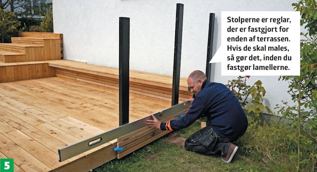 For enden af terrassen bygges et hegn, der skaber et lukket, hyggeligt rum på terrassen og giver læ. Hegnet består af tre stolper, der males sorte, inden der monteres lameller af terrassebrædder som på stødtrinnene. Tjek, at de sidder lige og med samme afstand (10 mm).