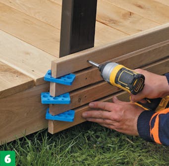 Sæt klodser fast på siderne, hvor der skal monteres terrassebrædder på højkant. Klodserne understøtter brædderne og giver dig noget at skrue brædderne fast i.